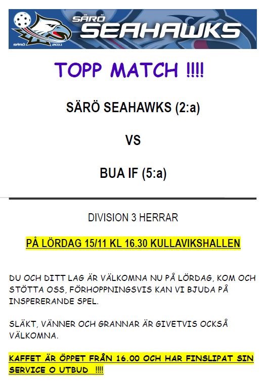Lördag den 15/11 kl 16.30 Särö Seahawks 10 nov 2014 0kommentarer